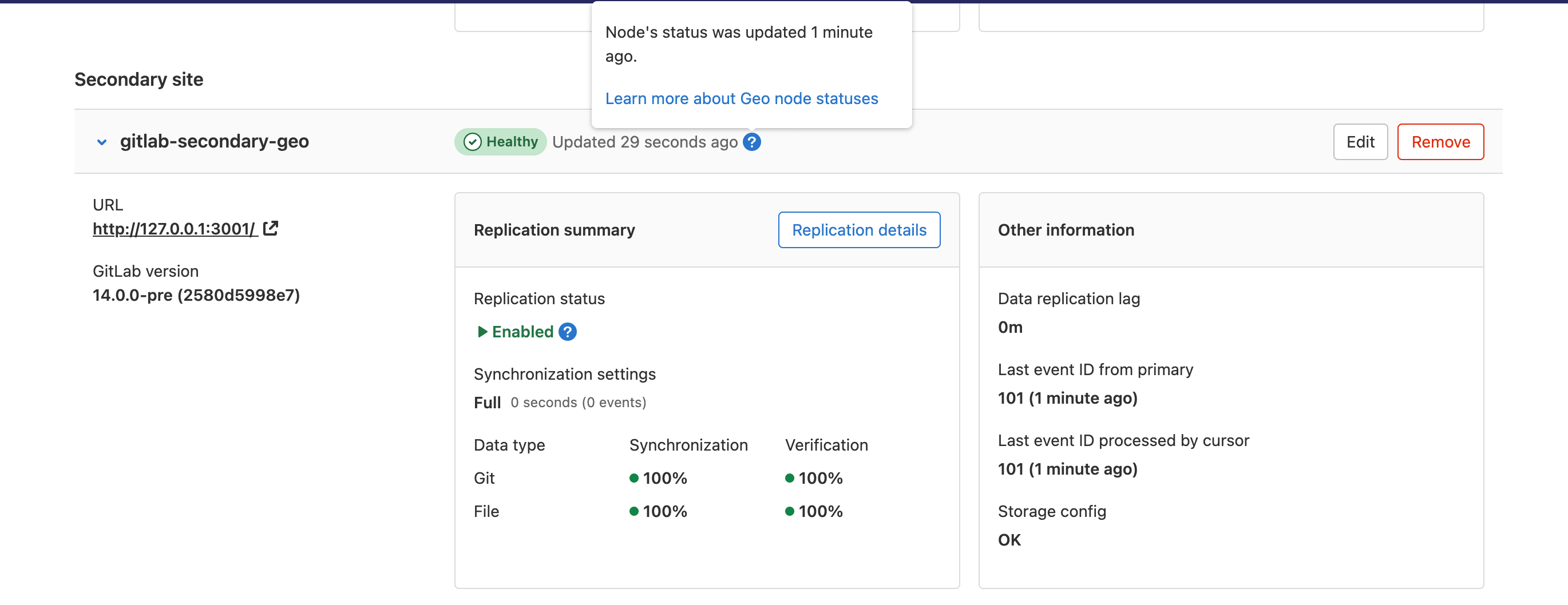 git fsckerror. If you are planning a failover, then consider prioritizing that the secondary site has the same information that the primary site has. Ensure you have a backup of the primary, and follow planned failover guidelines. - Push to the primary and check if the change gets replicated to the secondary site.
