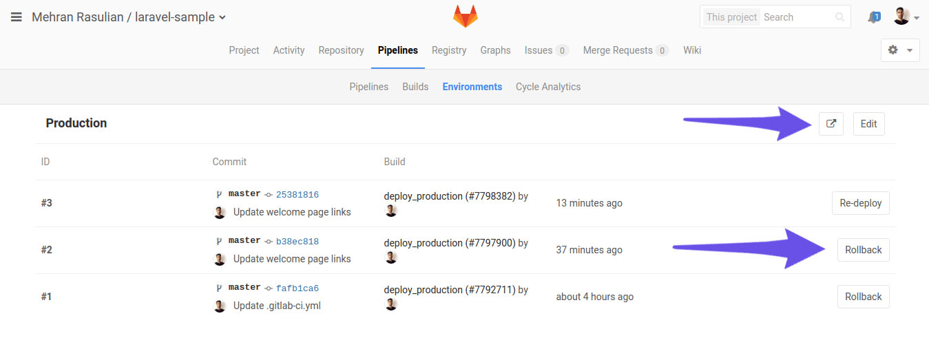 After our code passed through the pipeline successfully, we can deploy to our production server by selecting the play button on the right side.