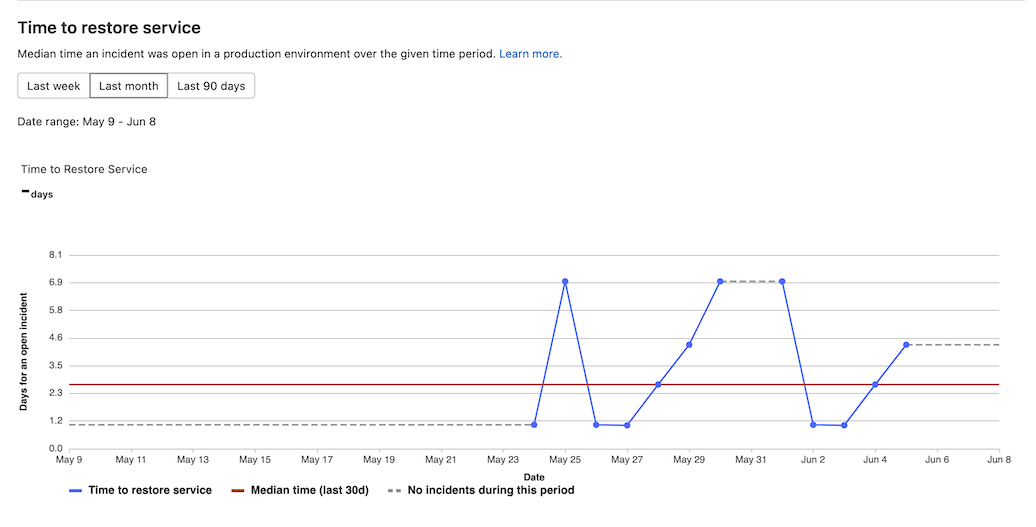 The time to restore service chart shows information about the median time an incident was open in a production environment. This chart is available for groups and projects.