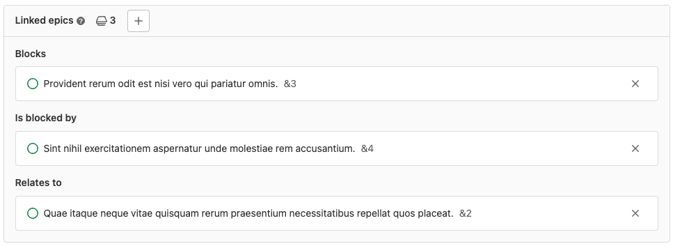 Linked epics are a bi-directional relationship between any two epics and appear in a block below the epic description. You can link epics in different groups.