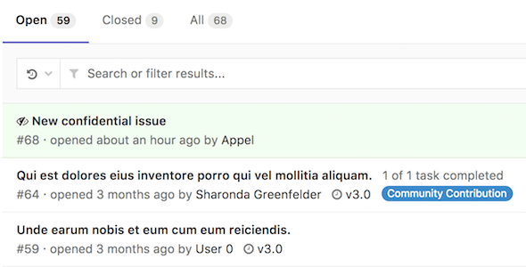 There are a few things that visually separate a confidential issue from a regular one. In the issues index page view, you can see the confidential ({eye-slash}) icon next to the issues that are marked as confidential: