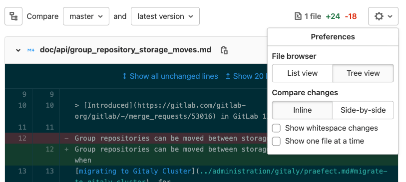 For larger merge requests, you can review one file at a time. You can change this setting temporarily in a merge request, or so it applies to all merge requests.